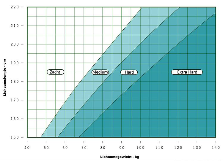 Uw lichaamsgewicht en lengte bepalen de hardheid van het matras. Bekijk bovenstaande tabel om uw ultieme slaapcomfort met het Anna Cloud matras te bepalen.